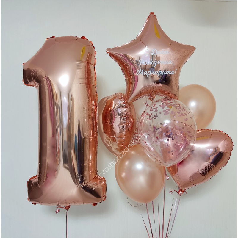 • Шар - МЕТАЛЛИК - 2 шт., • Шар - КОНФЕТТИ - 2 шт., • Шар - СЕРДЦЕ - 2 шт., • Шар - ЗВЕЗДА С НАДПИСЬЮ - 1 шт., • Шар - ЦИФРА, РОЗОВОЕ ЗОЛОТО - 1 шт. |