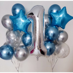 • Шар - ХРОМ - 14 шт., • Шар - КОНФЕТТИ - 6 шт., • Шар - ЗВЕЗДА - 2 шт., • Шар - ЦИФРА, СЕРЕБРО - 1 шт. |
