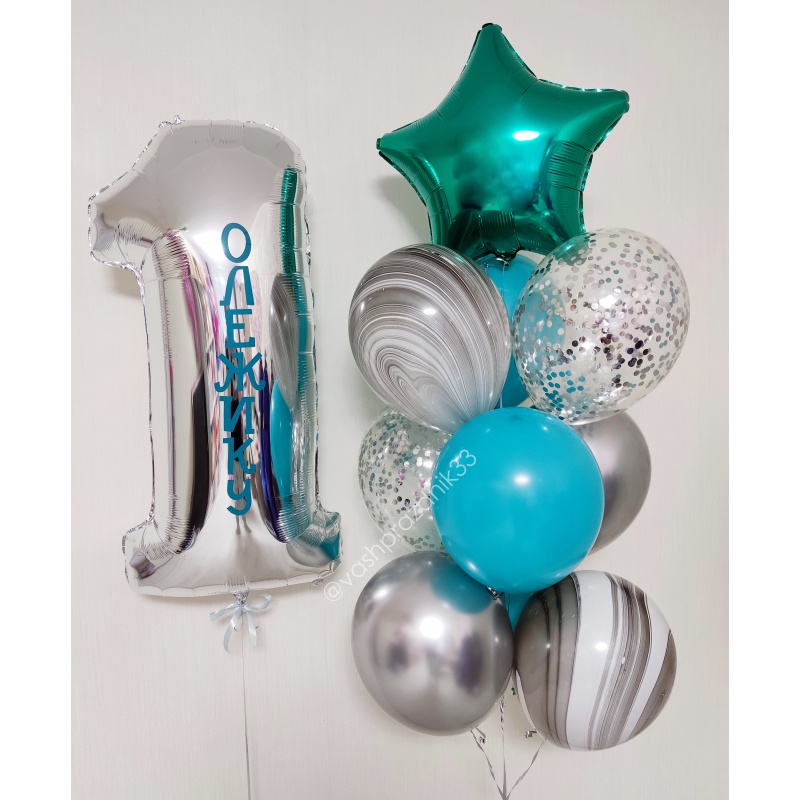 • Шар - ПАСТЕЛЬ - 3 шт., • Шар - ХРОМ - 2 шт., • Шар - СУПЕР АГАТ - 2 шт., • Шар - КОНФЕТТИ - 2 шт., • Шар - ЗВЕЗДА - 1 шт., • Шар - ЦИФРА, СЕРЕБРО С НАДПИСЬЮ - 1 шт. |