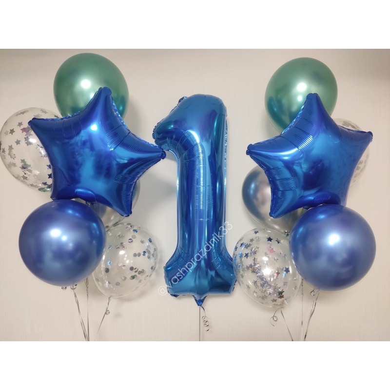 • Шар - ХРОМ - 6 шт., • Шар - КОНФЕТТИ - 4 шт., • Шар - ЦИФРА, СИНЯЯ - 1 шт. |