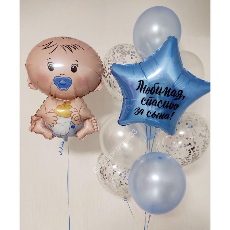 • Шар - ПЕРЛАМУТР - 5 шт., • Шар - КОНФЕТТИ - 3 шт., • Шар - ЗВЕЗДА С НАДПИСЬЮ - 1 шт., • Шар - ФИГУРА, МАЛЫШ МАЛЬЧИК - 1 шт. |