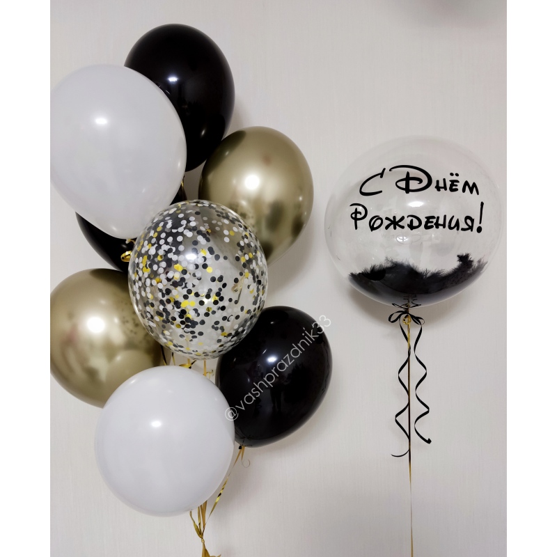 • Шар - ПАСТЕЛЬ - 6 шт.; • Шар - ХРОМ - 2 шт.; • Шар - КОНФЕТТИ - 1 шт.; • Шар - БАБЛС С ПЕРЬЯМИ И НАДПИСЬЮ - 1 шт. |