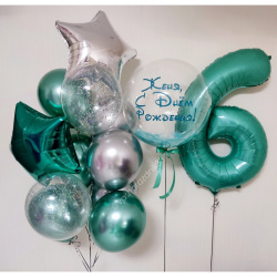 • Шар - ХРОМ - 7 шт., • Шар - КОНФЕТТИ - 2 шт., • Шар - ЗВЕЗДА - 2 шт., • Шар - БАБЛС С ПЕРЬЯМИ И НАДПИСЬЮ - 1 шт., • Шар - ЦИФРА, БИСКАЙСКИЙ ЦЕЛЕНЫЙ - 1 шт. |