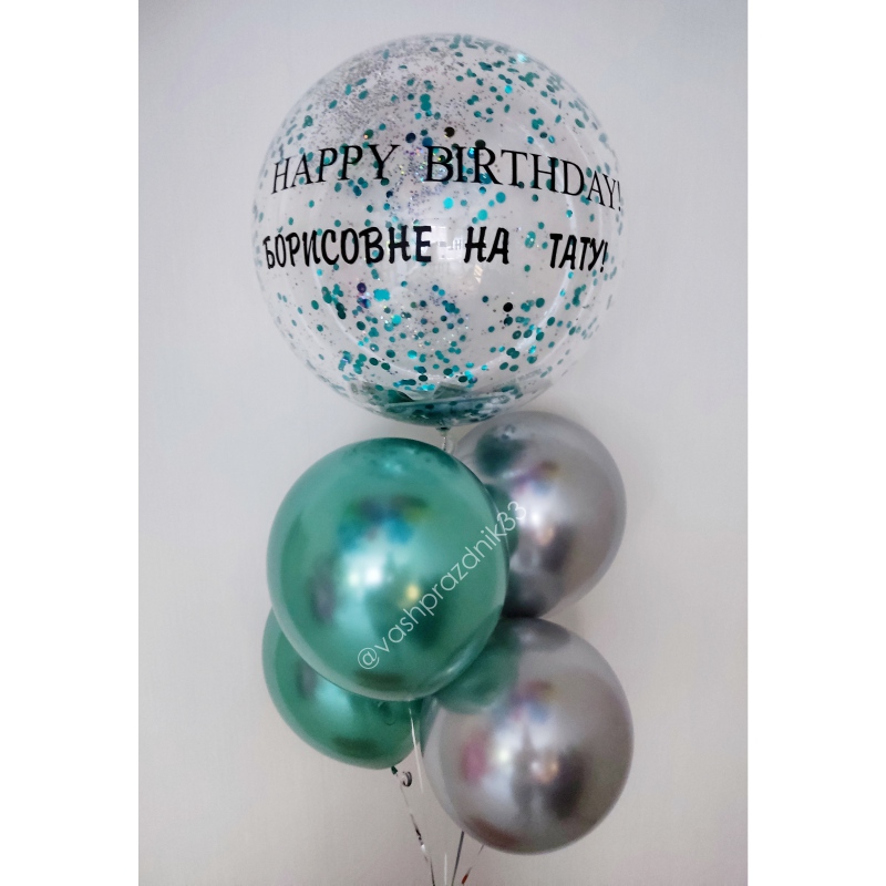 • Шар - ХРОМ - 4 шт., • Шар - БАБЛС С КОНФЕТТИ И НАДПИСЬЮ - 1 шт. |
