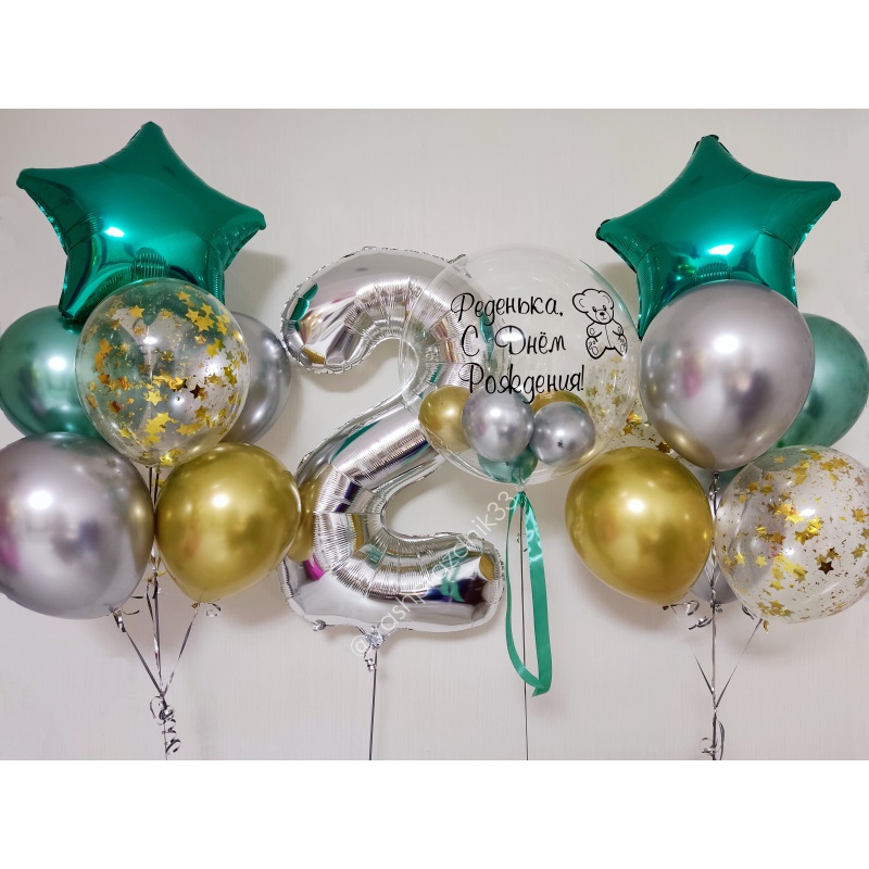 • Шар - ХРОМ - 8 шт.; • Шар - КОНФЕТТИ - 4 шт.; • Шар - ЗВЕЗДА - 2 шт.; • Шар - БАБЛС С ШАРИКАМИ И НАДПИСЬЮ - 1 шт.; • Шар - ЦИФРА, СЕРЕБРО - 1 шт. |