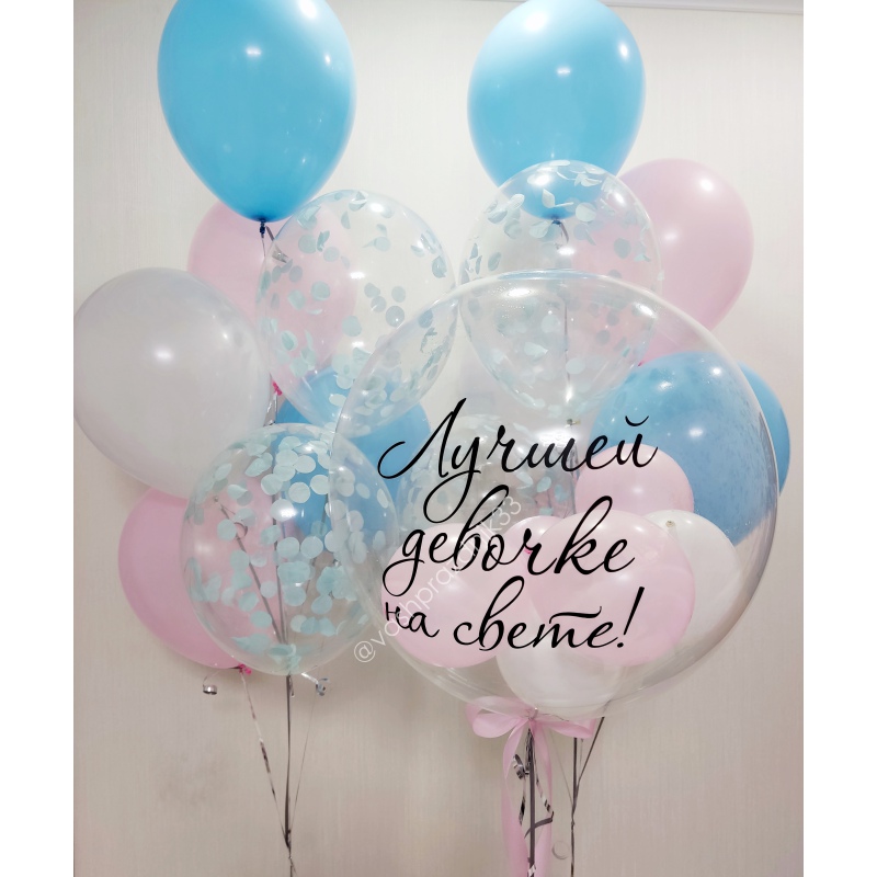 • Шар - ПАСТЕЛЬ - 10 шт., • Шар - КОНФЕТТИ - 4 шт., • Шар - БАБЛС С ШАРИКАМИ И НАДПИСЬЮ - 1 шт. |