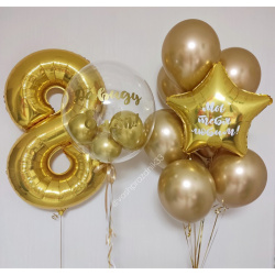 • Шар - ХРОМ - 8 шт., • Шар - ЗВЕЗДА С НАДПИСЬЮ - 1 шт., • Шар - БАБЛС С ШАРИКАМИ И НАДПИСЬЮ - 1 шт., • Шар - ЦИФРА, ЗОЛОТО - 1 шт. |