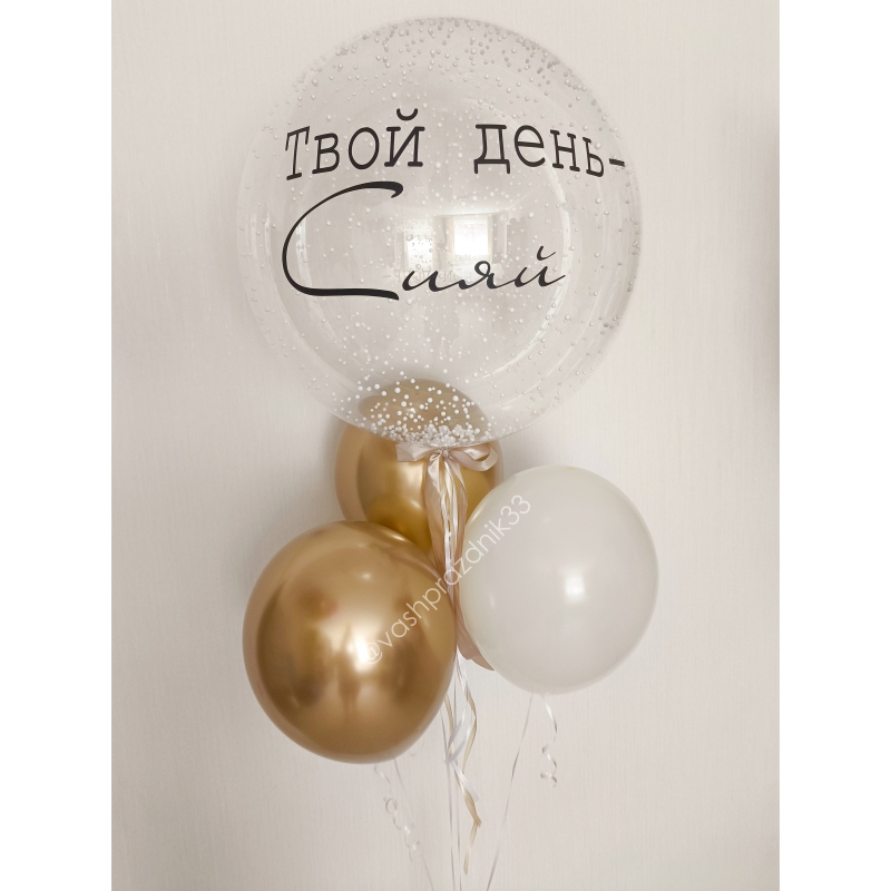 • Шар - ПАСТЕЛЬ - 1 шт., • Шар - ХРОМ - 2 шт., • Шар - БАБЛС С ПЕНОПЛАСТОМ И НАДПИСЬЮ - 1 шт. |