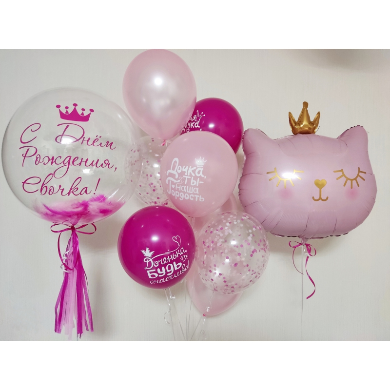• Шар - МЕТАЛЛИК - 3 шт., • Шар - ДР, ДОЧКА - 3 шт., • Шар - КОНФЕТТИ - 2 шт., • Шар - ФИГУРА, КОТЁНОК ПРИНЦЕССА - 1 шт., • Шар - БАБЛС С НАДПИСЬЮ И ПЕРЬЯМИ - 1 шт. |
