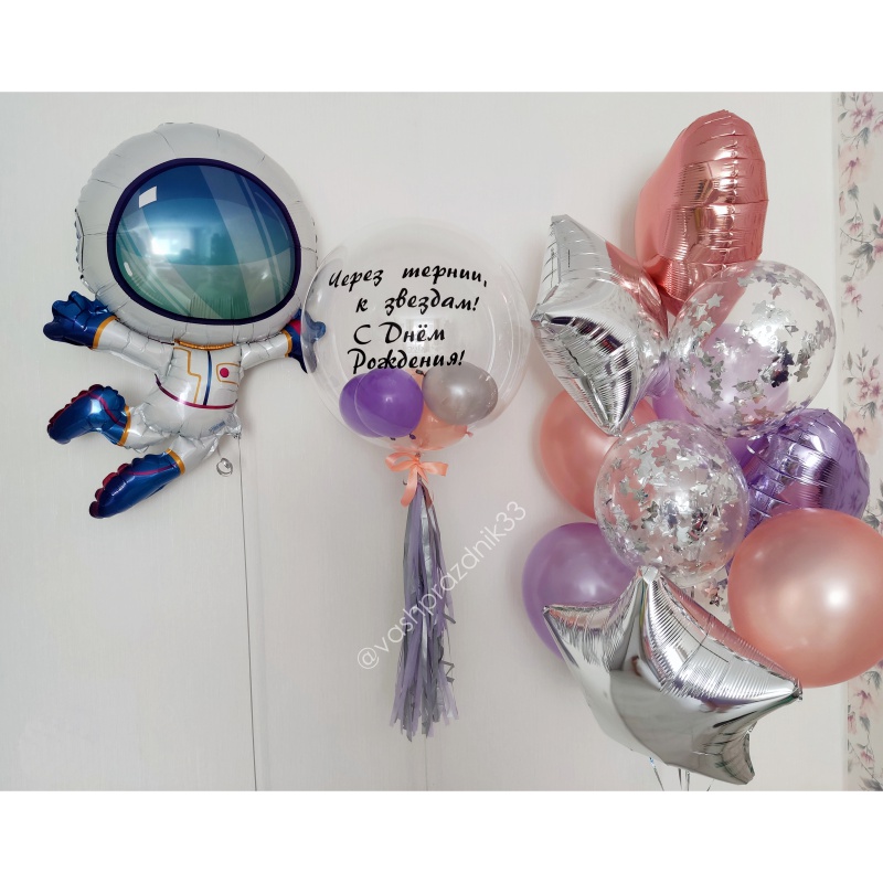 • Шар - МЕТАЛЛИК - 4 шт., • Шар - КОНФЕТТИ - 3 шт., • Шар - ЗВЕЗДА - 2 шт., • Шар - СЕРДЦЕ - 2 шт., • Шар - БАБЛСЯ С ШАРИКАМИ - 1 шт., • Шар - ФИГУРА, КОСМОНАВТ - 1 шт. |