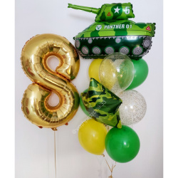 • Шар - ПАСТЕЛЬ - 5 шт., • Шар - КОНФЕТТИ - 3 шт., • Шар - ЗВЕЗДА, КАМУФЛЯЖ - 1 шт., • Шар - ФИГУРА, ТАНК - 1 шт., • Шар - ЦИФРА, ЗОЛОТО - 1 шт. |