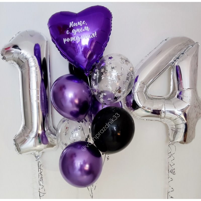 • Шар - ПАСТЕЛЬ - 2 шт., • Шар - ХРОМ - 3 шт., • Шар - КОНФЕТТИ - 2 шт., • Шар - СЕРДЦЕ С НАДПИСЬЮ - 1 шт., • Шар - ЦИФРА, СЕРЕБРО - 2 шт. |
