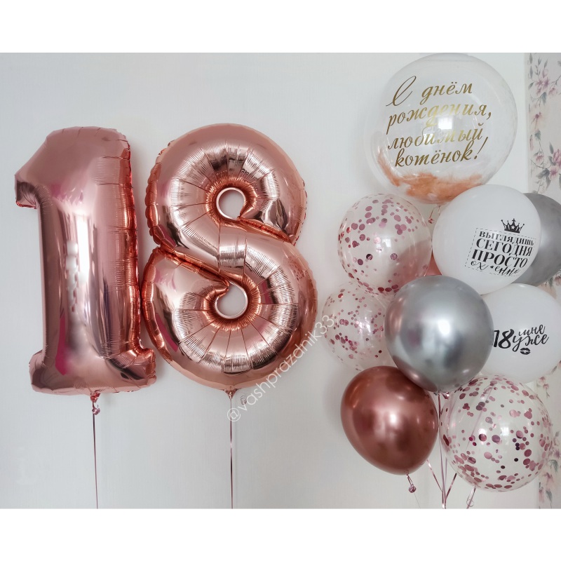 • Шар - ХРОМ - 4 шт., • Шар - ХВАЛЕБНЫЕ - 2 шт., • Шар - КОНФЕТТИ - 3 шт., • Шар - БАБЛС С ПЕРЬЯМИ И НАДПИСЬЮ - 1 шт., • Шар - ЦИФРА, РОЗОВОЕ ЗОЛОТО - 2 шт. |