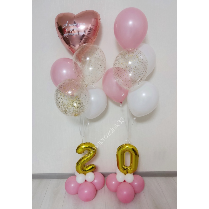 • Шар - ПАСТЕЛЬ - 6 шт., • Шар - КОНФЕТТИ - 3 шт., • Шар - СЕРДЦЕ С НАДПИСЬЮ - 1 шт., • Шар - МИНИ-ЦИФРА, ЗОЛОТО НА ПОДСТАВКЕ - 2 шт. |