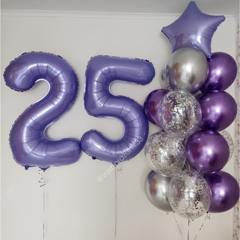 • Шар - ХРОМ - 10 шт., • Шар - КОНФЕТТИ - 5 шт., • Шар - ЗВЕЗДА - 1 шт., • Шар - ЦИФРА, ФИОЛЕТОВАЯ - 2 шт. |
