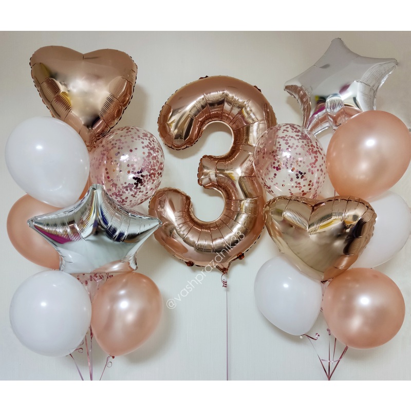 • Шар - ПАСТЕЛЬ - 6 шт., • Шар - МЕТАЛЛИК - 6 шт., • Шар - КОНФЕТТИ - 4 шт., • Шар - ЗВЕЗДА - 2 шт., • Шар - СЕРДЦЕ - 2 шт., • Шар - ЦИФРА, РОЗОВОЕ ЗОЛОТО - 1 шт. |