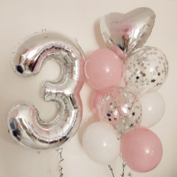 • Шар - ПАСТЕЛЬ - 6 шт., • Шар - КОНФЕТТИ - 3 шт., • Шар - СЕРДЦЕ - 1 шт., • Шар - ЦИФРА, СЕРЕБРО - 1 шт. |