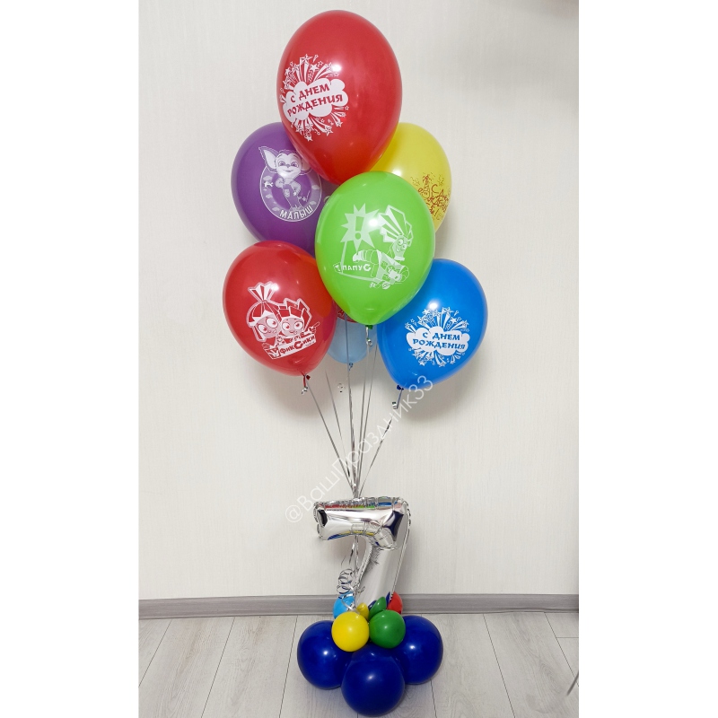 • Шар - С РИСУНКОМ - 7 шт., • Шар - ЦИФРА НА ПОДСТАВКЕ, СЕРЕБРО - 1 шт. |