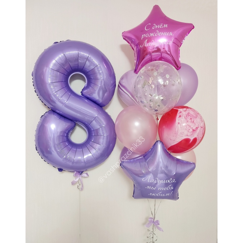 • Шар - ПЕРЛАМУТР - 4 шт., • Шар - АГАТ - 2 шт., • Шар - КОНФЕТТИ - 2 шт., • Шар - ЗВЕЗДА С НАДПИСЬЮ - 2 шт., • Шар - ЦИФРА, СИРЕНЕВАЯ - 1 шт. |