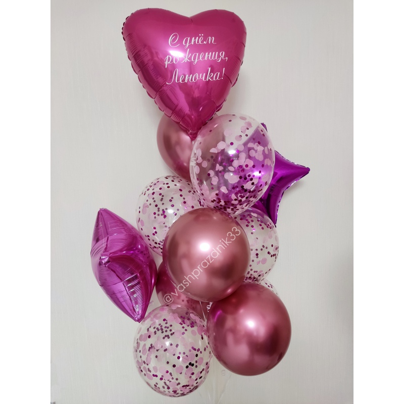 • Шар - ХРОМ - 4 шт., • Шар - КОНФЕТТИ - 5 шт., • Шар - ЗВЕЗДА - 2 шт., • Шар - СЕРДЦЕ С НАДПИСЬЮ - 1 шт. |
