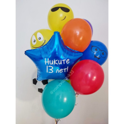 • Шар - ПАСТЕЛЬ - 5 шт., • Шар - СМАЙЛ - 3 шт., • Шар - ФУТБОЛЬНЫЙ МЯЧ - 2 шт., • Шар - ЗВЕЗДА С НАДПИСЬЮ - 1 шт. |