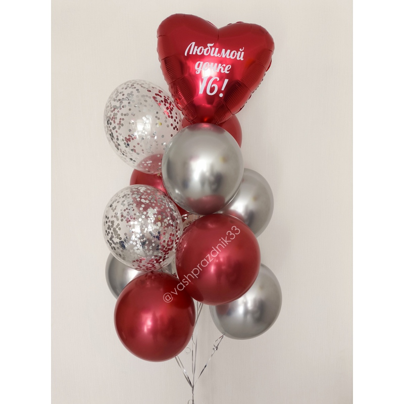 • Шар - ХРОМ - 8 шт., • Шар - КОНФЕТТИ - 3 шт., • Шар - СЕРДЦЕ С НАДПИСЬЮ - 1 шт. |