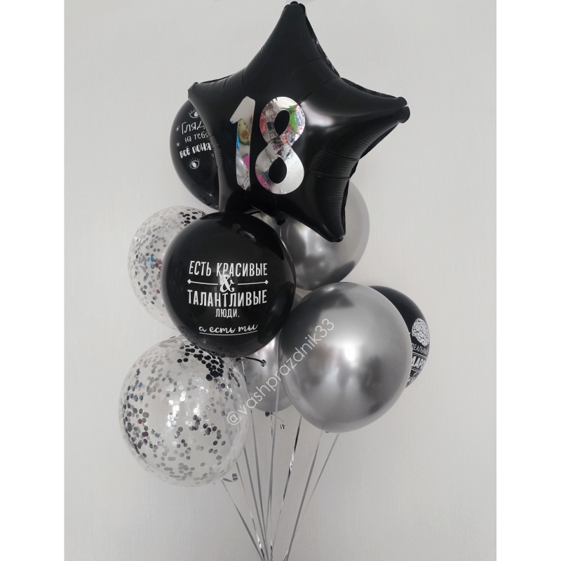 • Шар - ЮМОР - 3 шт.; • Шар - ХРОМ - 3 шт.; • Шар - КОНФЕТТИ - 2 шт.; • Шар - ЗВЕЗДА С НАДПИСЬЮ - 1 шт. |