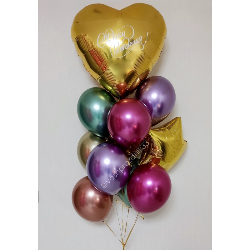 • Шар - ХРОМ - 9 шт., • Шар - ЗВЕЗДА - 1 шт., • Шар - БОЛЬШОЕ СЕРДЦЕ С НАДПИСЬЮ - 1 шт. |
